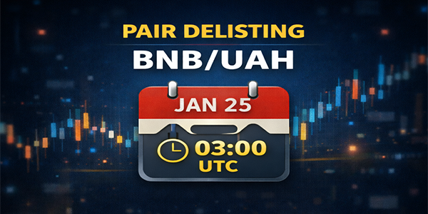 Due to low liquidity, BNB/UAH will be removed from EXMON on January 25, 2026 at 03:00 UTC.